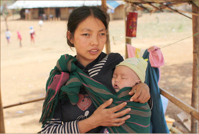 Mother and child in a camp for displaced persons at Kutkai in Lashio