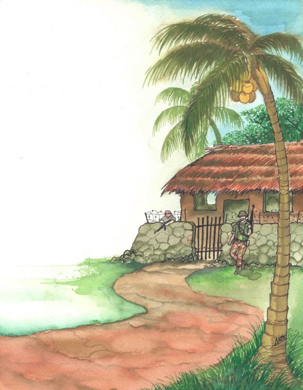 Meanwhile I’m brought to other houses though beautiful rolling countryside studded with coconut trees. There are fox holes along the way, wire fences, and earth works thrown up around the houses just in case of an attack. They are just as welcoming here, and before I left, the men asked me again, “Would you help?” “What kind of help?” I countered, “That’s up to you,” they said. “All right,” says I, “I’ll go and visit the other side and see what can be done.” “The one you ask for is Commander Erning,” they suggested. “This is going to be tough one,” I thought. Yes. They were indeed looking for peace but were yet on a war footing, in battle fatigues, carrying every imaginable weapon. For sure there’s a lot of prayer needed here. I thought, a Muslim friend was a delighted as she was surprise at the news. “You know,” she said, “they could not ask another Muslim to do that. It might appear as weakness.”
