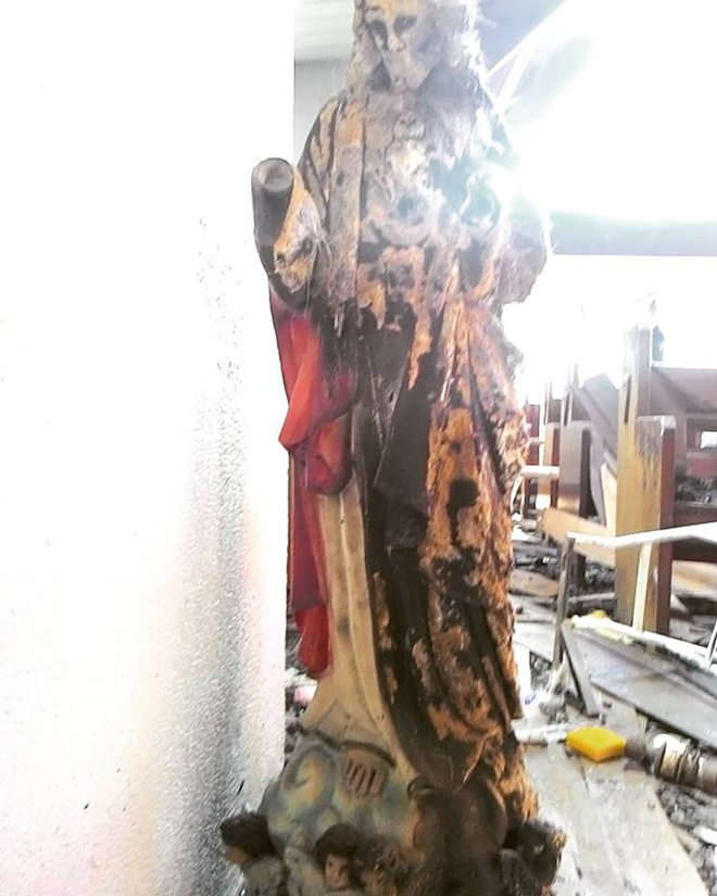 When I saw the altar, I was shocked. The large crucifix hadn’t been touched by fire. I genuflected to it as a sign of reverence to the Lord. I started to sing hymns we use at Mass. I went to the sacristy to get corporals with which to wrap the pyx containing the Blessed Sacrament. I put on my sotana and handed the Paschal Candle to the guard. As I opened the tabernacle I started to sing ‘O Sacrament Most Holy, O Sacrament Divine’. I wrapped the pyx and placed the Blessed Sacrament in my pocket. Before leaving I looked at the crucifix. The Lord seemed to be saying to me, ‘Lambert, Anak. Don’t worry, I am here pa. I am safe. You can take me. We conquered the fire, I stood up and I am here.’ That was a moment I will never forget. He clearly spoke to my heart.