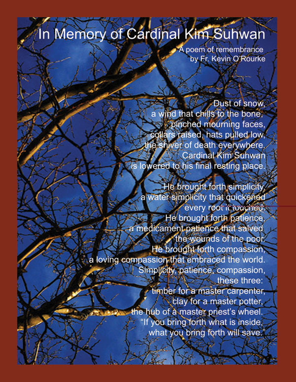 Cardinal Kim finally rests in God’s dwelling place yet lives in the hearts of those people whose lives he touched. God has commissioned each of us ‘to build a world in accord with the Gospel’ and Cardinal Kim responded to it accordingly. His is a life of testimony of building a nation and fulfilling his vision of a ‘Church for the people, especially the marginalized.’