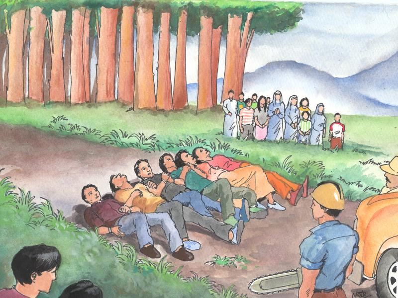 The parish priest and leaders of the Basic Ecclesial Communities of Wao decided to do something to stop the logging of their forest. They put up a barricade at the crossing of the barangay road that leads to the logging area and the national highway. Last July 12 a meeting was convened by the president of the diocesan clergy of Bukidnon to solicit the support of the local officials of Wao for the barricade started by the local church, Two weeks of rotation of BEC cluster leaders watching the barricade encouraged the priests of the churches of Malaybalay Diocese where Wao belongs through ecclesiastical arrangement. The priests of the Diocese supported the move of the local church of Wao by joining the leaders of Wao at the barricade site. The move was done by the religious sister of Bukidnon where they scheduled their presence at the barricade, two to five sisters at a time (two days for each group) at the barricade, for two weeks. There were about 300 people present representing the parishes of Bukidnon, RSP and organizations and NGO’S from Bukidnon, Lanao del Norte, Aguisan del Sur and del Norte, Davao, Cagayan de Oro.