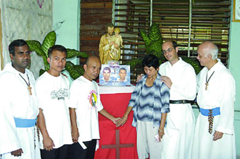 Mauricio Laspuna (3rd left) and his wife, Conrada hold hands as they remember their son, Marco Laspuna (at right in photo on altar) yesterday at Missionaries of the Poor's Corpus Christi complex at3 North Street, downtown Kingston. The Laspunas, along with another son, Douglas (2nd left) arrived in the island this week for Brother Marco's funeral tomorrow. With the family are Father Ambrose (left), a senior priest of the Missionaries of the Poor; Father Fidelis Stoeckl (2nd right), who serves as a missionary in The Philippines; and Father Richard HoLung, founder/leader of the Missionaries of the Poor. (Photo: Karl McLarty)