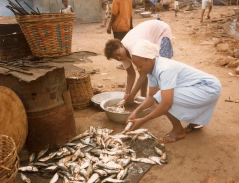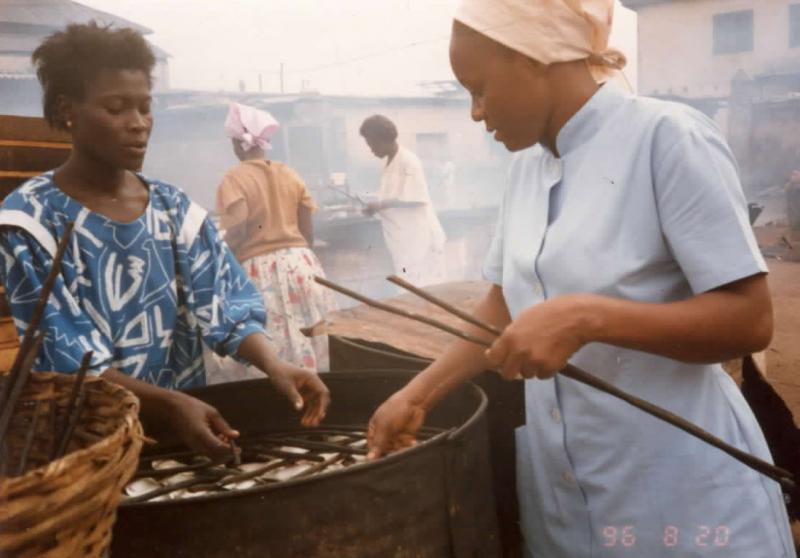 Sr. Mercy Benson prior to her perpetual profession, with a woman fish vendor, in one of the poor areas in Accra, capital of Ghana.