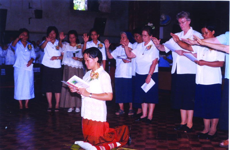 I was very happy, however, that I could return to the Philippines and to my native place to make my Perpetual Vows before the people most dear to my heart: my mother, my two brothers, my sister, my nieces and nephews, my relatives and friends and the Columban Sisters, Fathers and Lay Missionaries. It was a day never to be forgotten and a celebration that drew together the various strands of my life into a fitting offering to God. A Subanen flute and gong were played during the Entrance Procession and two Subanen dancers led us to the sanctuary. At the Offertory there were symbols offered: flowers, soil, a cross, candles, a Bible, a Kachin cloth from Myanmar, all accompanied by traditional Kachin Manau music. A variety of languages was used during the liturgy: Visayan, my native language; Tagalog; Subanen, the language of the people with whom I first worked after Profession; Kachin, the language of the people of Myanmar with whom I now live and work, and English.