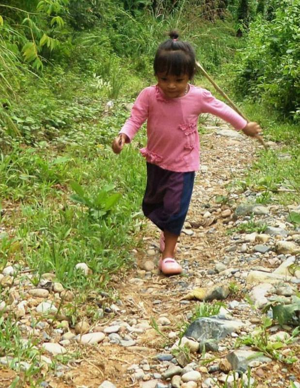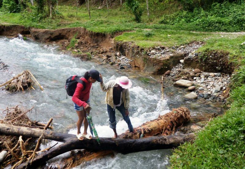 While we carried the food, little two-year-old Crezlen confidently strode beside us with her walking stick. Even at two years of age Subanen children are seasoned hikers. Along the way we had to carefully cross a river over slippery logs. Luckily, the river was not in flood; then crossing it would be impossible. After many hours of hiking we finally arrived home in the late afternoon.