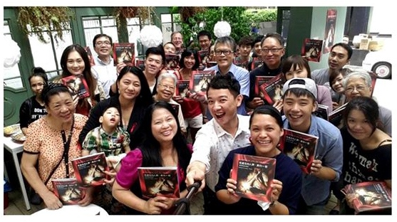 Hsinchu exhibition 1st opening, L-R: Nicole Yang, founder of Harmony Home Foundation Taiwan; Fr Peter O'Neill, director of Hsinchu Migrants and Immigrants Service Center and Migrants' chaplain of Diocese of Hsinchu; Jao Resari, Agape Center; Bishop James Li Tan-kuei, Bishop-Emeritus of Hsinchu; Teacher Hank, volunteer of Harmony Home Foundation Taiwan
