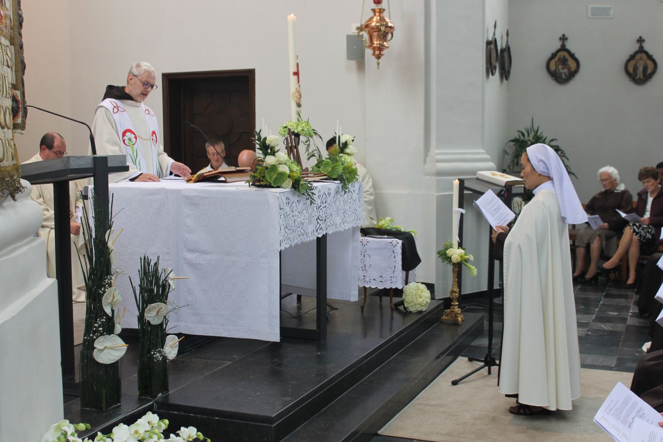 The profession rites took place after the Gospel and homily. They began with a brief dialogue with Fr. Provincial wherein the bride's firm intention to belong fully to God for the rest of her life was manifested. Then the Litany of the Saints was sung, the names of San Lorenzo Ruiz and San Pedro Calungsod being added, while the bride prostrated herself on the ground in the form of a cross as a sign of her total surrender to God. Then we heard her pronounce her vows in Flemish in a voice full of conviction: “I, Sr. Marie Paul Thérèse of Jesus the Good Shepherd, desiring to live faithfully a life of allegiance to Jesus Christ, with my Sisters as witnesses, into your hands, Rev. Mother Lutgardis of Mary, vow to Almighty God perpetual chastity, poverty and obedience according to the Rule and Constitutions of the Discalced Nuns of the Blessed Virgin Mary of Mt. Carmel . . . To give eternal glory to the Most Holy Trinity."
