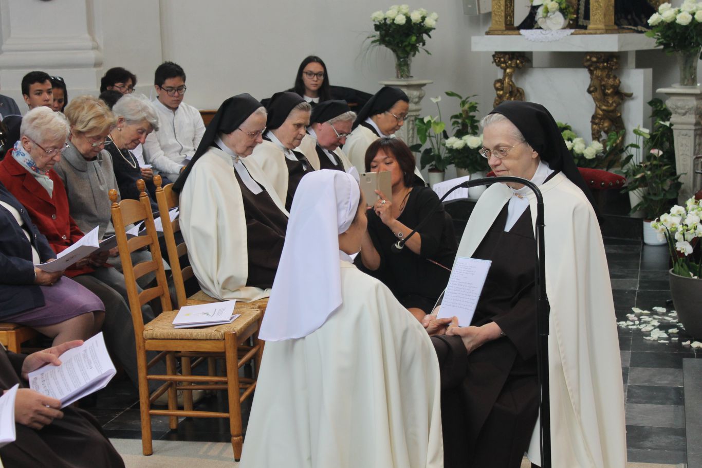 On Sunday October 1, 2017, the feast of St. Thérèse of Lisieux, the sun was shining brightly in Vilvoorde, Belgium. The Carmelite monastery church, the Basilica of Our Lady of Consolation, was beautifully decorated with white flowers and filled with more than the usual Sunday attendance. The atmosphere was festive as Sr. Marie Paul Thérèse of Jesus the Good Shepherd, our youngest Sister, pronounced her perpetual vows in the Order of Our Lady of Mount Carmel during the Solemn Mass that began at 3pm.