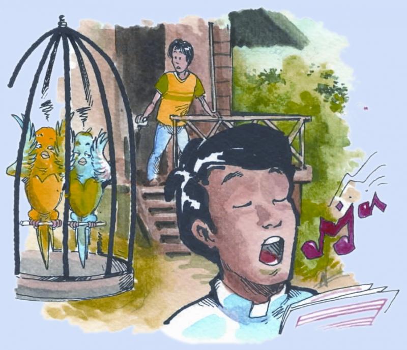 I accompanied Stephen, a seminarian, to his hometown in Lezo, Aklan.  The day was hot so I decided to go outside their house and practice songs  for Holy Saturday. I didn’t notice that there were lovebirds in a cage beside me.  Stephen came out and asked me what happened to their love birds. They  stopped chirping. I said,‘Stephen, I believe they’re mesmerized by my angelic voice.’