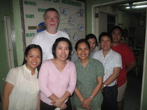 Fr Eamon Sheridan with lay missionaries Joan Yap, Reins Mosqueda, Au Luceno, Sherryl Lou Capili, Rowena Cuanico, Nanise Mo'unga
